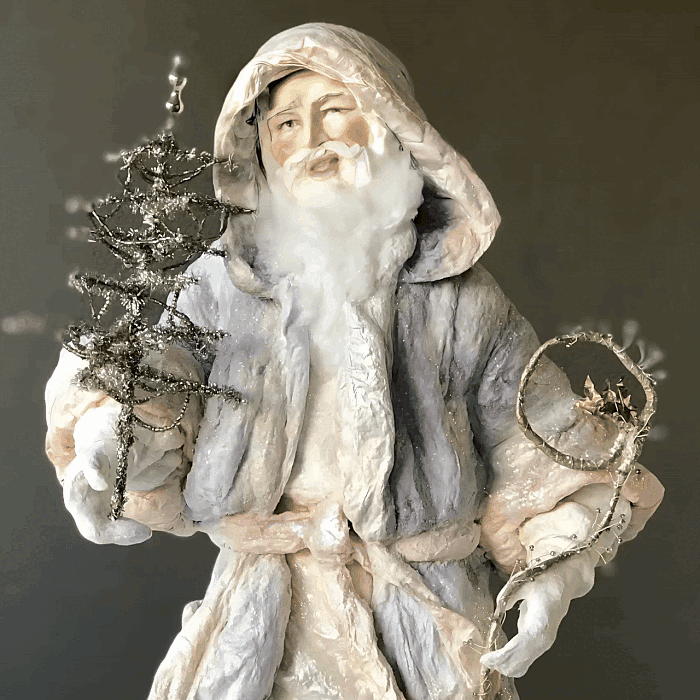 The middle brother has a more earthy and rustic charm. He wears a tea-colored hat, adorned with sprigs of Christmas holly, the deep green leaves contrasting beautifully with the bright red berries. His beard, made from raw cotton, has a slightly rugged texture, but it shimmers softly in the light, thanks to the sprinkling of natural mica that dusts it. This Santa has a more outdoorsy feel as if he’s just come in from gathering holly and pinecones, bringing the essence of nature and the holiday season into your home.