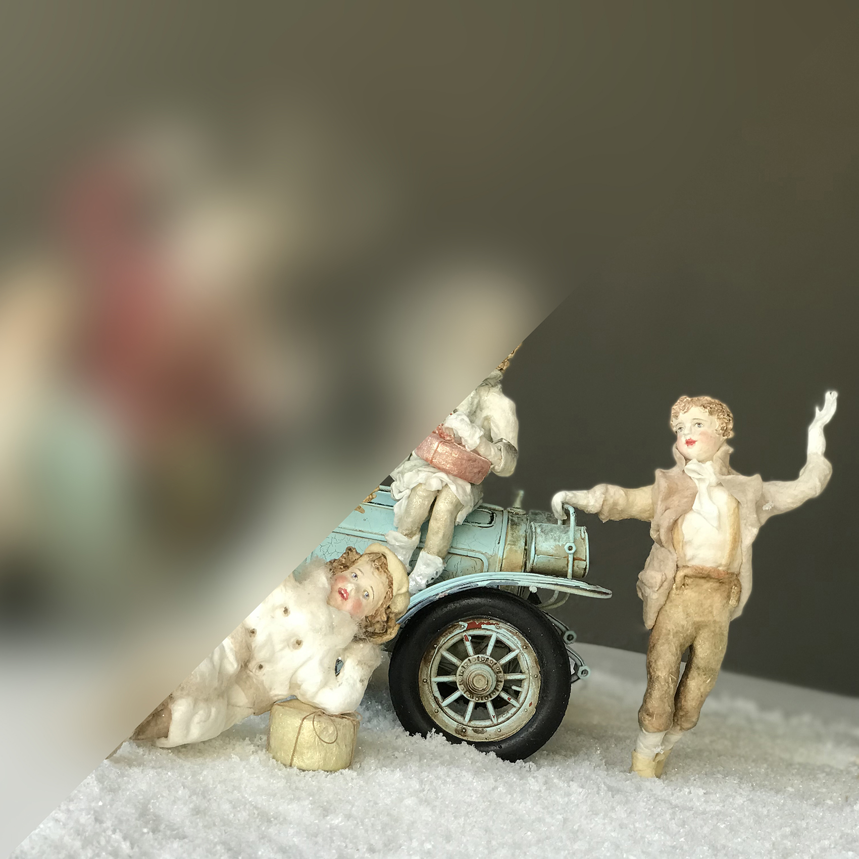Princess Leila wears a celestial cotton costume, her flowing gown displaying delicate cornflower patterns that swirl gracefully around her. In addition, a shimmering gold frill collar frames her regal neckline, catching the soft glow of the holiday lights. Also, her clay face, gentle and serene, reflects the twinkling lights of the room.